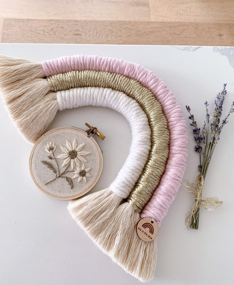This rainbow is made for the girly girls , for the ultimate princess for the girl who dreams of growing up to someday be a real life princess . Made with beautiful shades of blush + ballet pink and highlighted with gold luxe string and a pretty frizzy centre . This rainbow is sure to make your little girl feel like a princess .